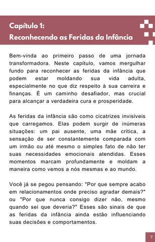Chegou a hora de se libertar das amarras emocionais que têm segurado seu crescimento e sua prosperidade financeira. Nosso método é cuidadosamente desenhado para ajudar você a identificar e ressignificar as feridas da infância, transformando dor em poder e traumas em trampolins para o sucesso.